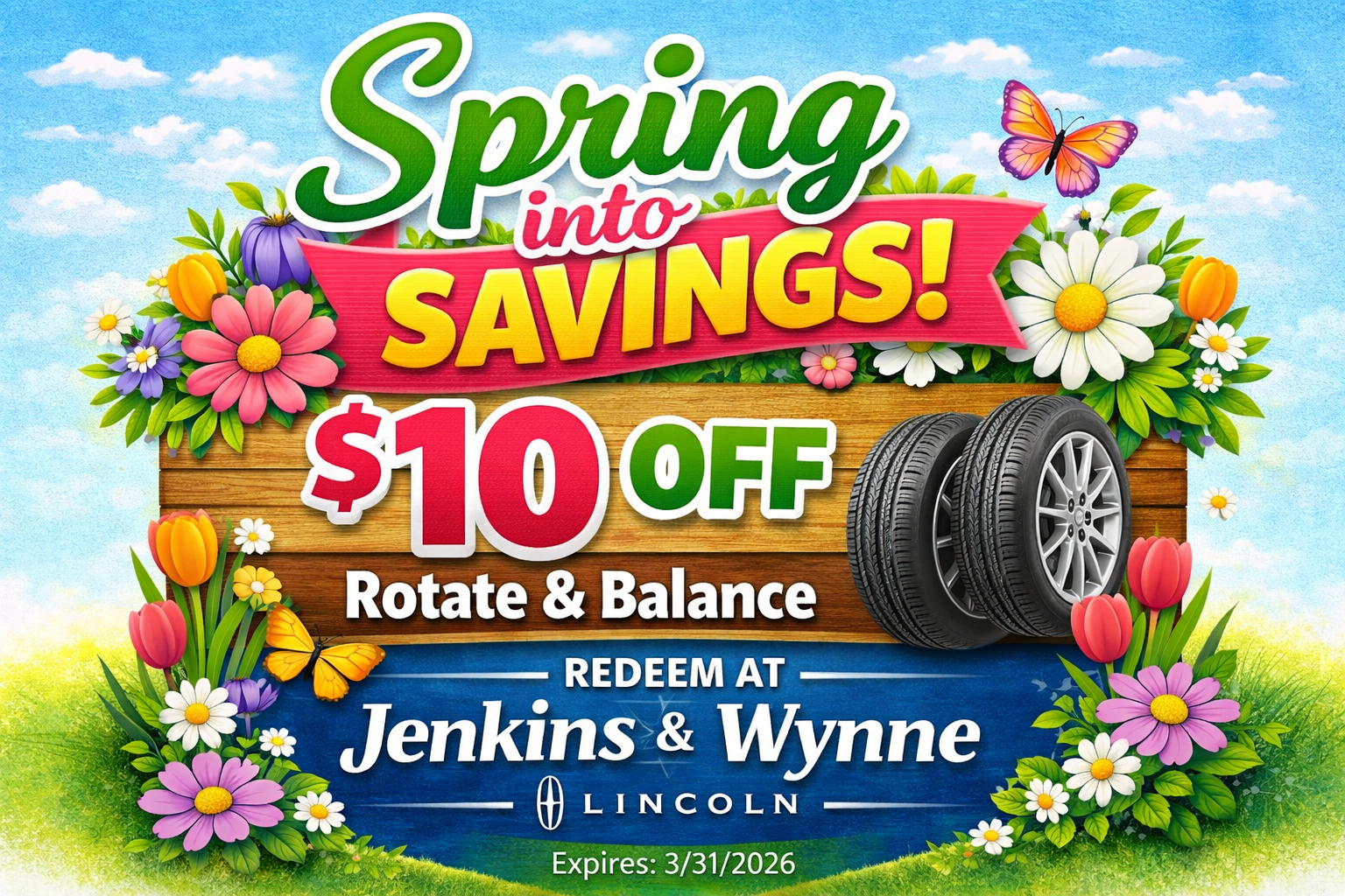 $10 off Tire Rotation and Balance. Valid only at Jenkins and Wynne Lincoln Service. Must present coupon at time of service write-up. Cannot be combined with other offers or discounts. Not valid on prior purchases. Taxes, disposal fees, and shop supplies may apply. Expires 3/31/2026.