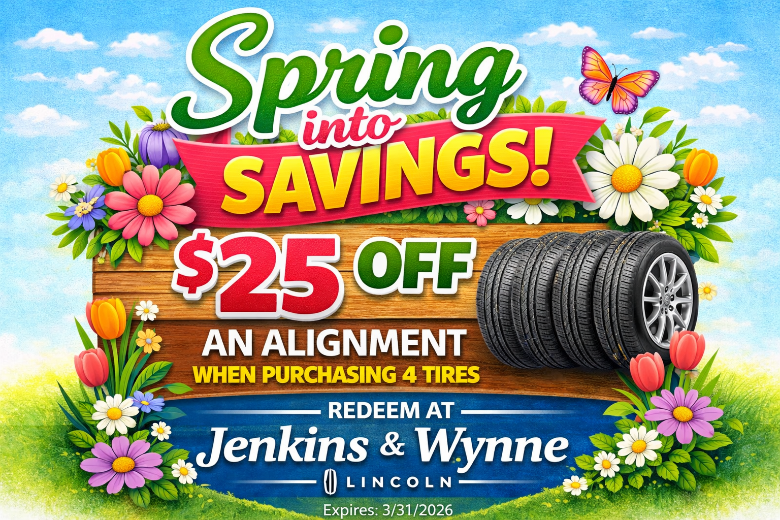 $25 off wheel alignment with purchase of four tires. Valid only at Jenkins and Wynne Lincoln Service. Must present coupon at time of service write-up. Cannot be combined with other offers or discounts. Not valid on prior purchases. Taxes, disposal fees, and shop supplies may apply. Expires 3/31/2026.