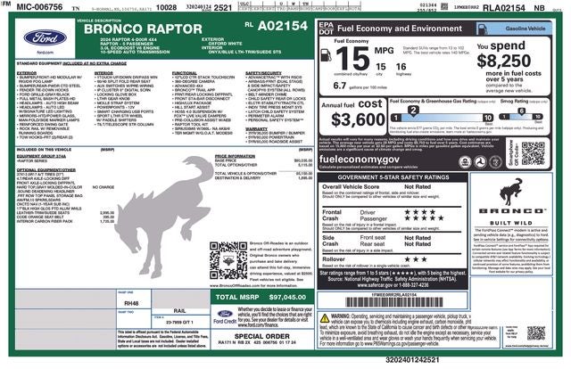 This 2024 Ford Bronco Raptor is a true off-road powerhouse, ready to take on any adventure. Boasting a 3.0L EcoBoost V6 engine and 10-speed automatic transmission with 4WD, this Bronco Raptor delivers impressive performance and capability. Standout features include:
