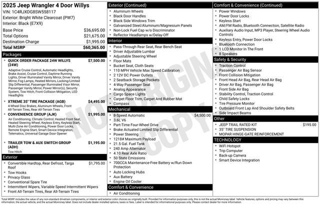 This Wrangler Willys is equipped with the Quick Order Package 24W, giving you a host of premium features like LED headlights, fog lights, and premium wrapped steering wheel. The Xtreme 35 Tire Package provides unparalleled off-road performance with its oversized tires, upgraded brakes, and enhanced suspension. The Convenience Group adds creature comforts like remote start, heated seats, and automatic climate control.